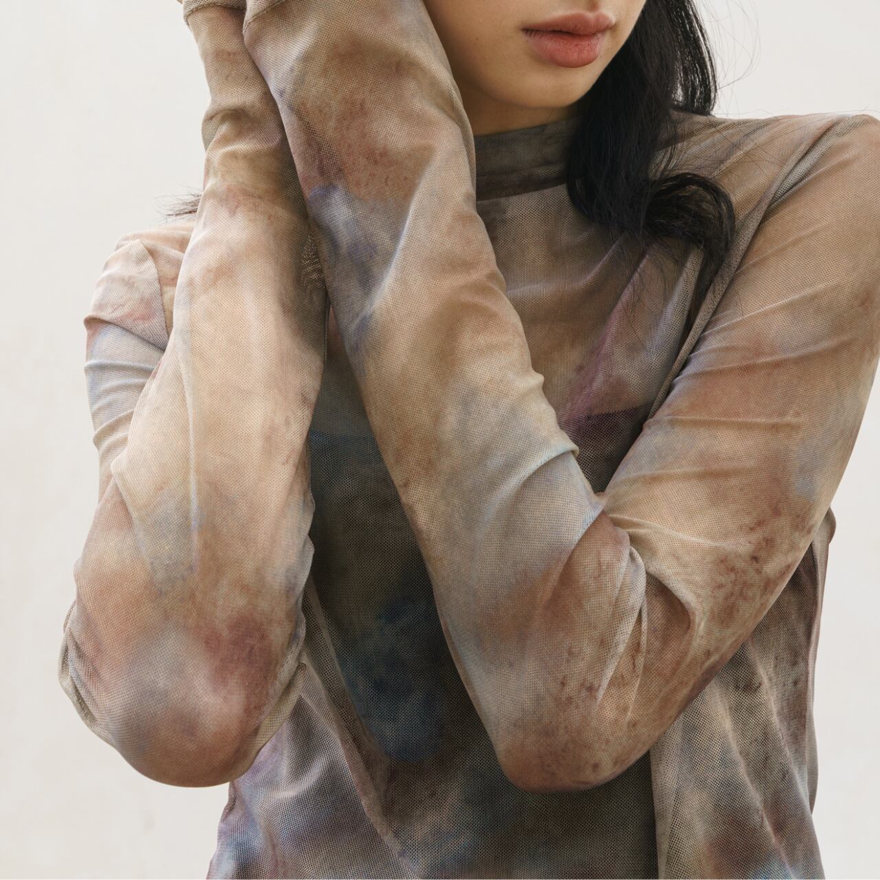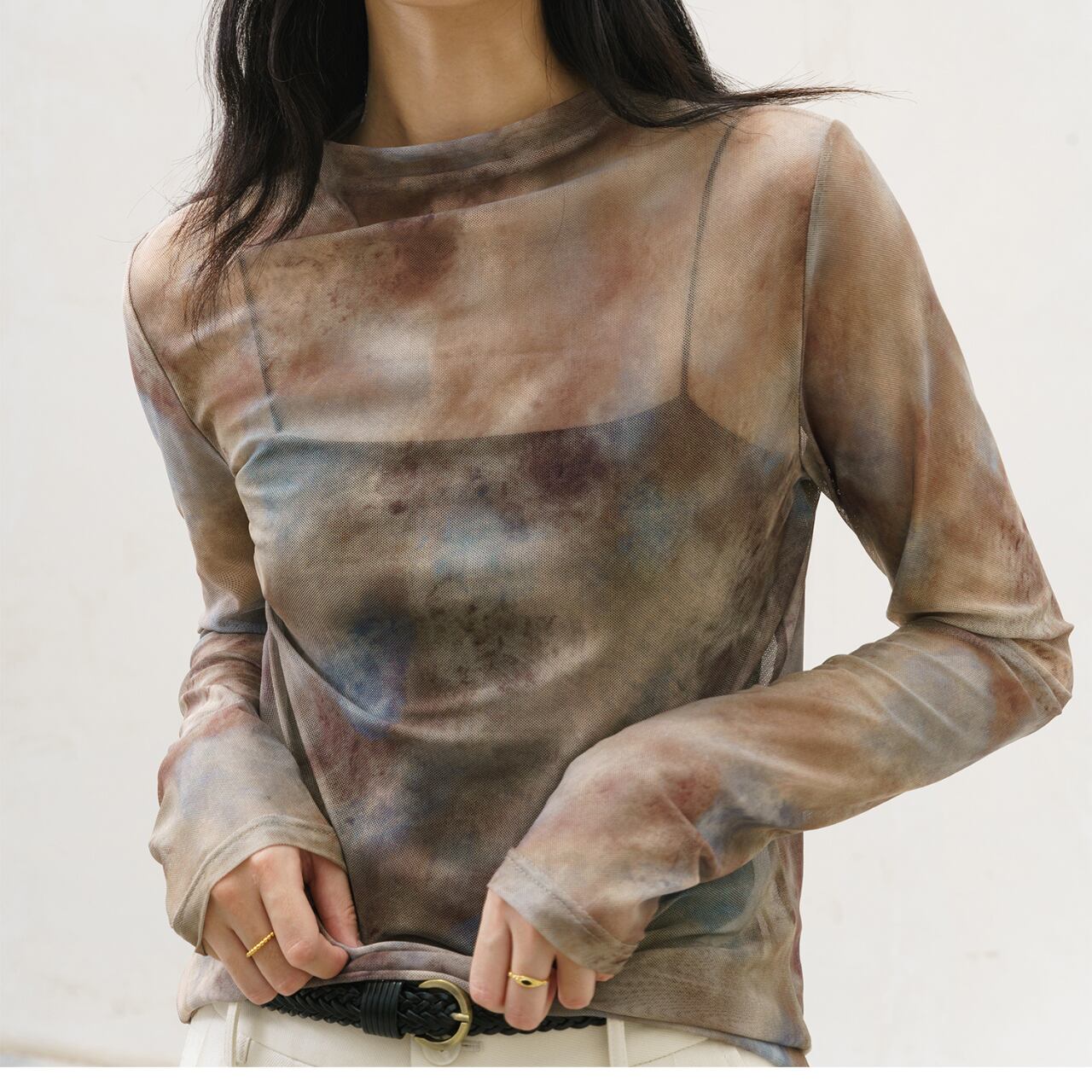絶妙な透け感と、雲のような滲むような柄が、女性らしい雰囲気を演出します。