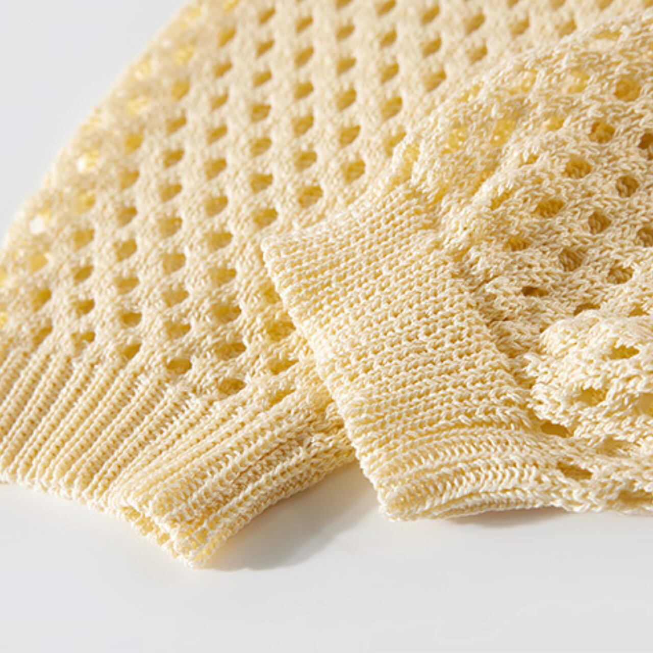 繊細な透かし編みと、すっきりとしたボートネックが女性らしい雰囲気を演出します。