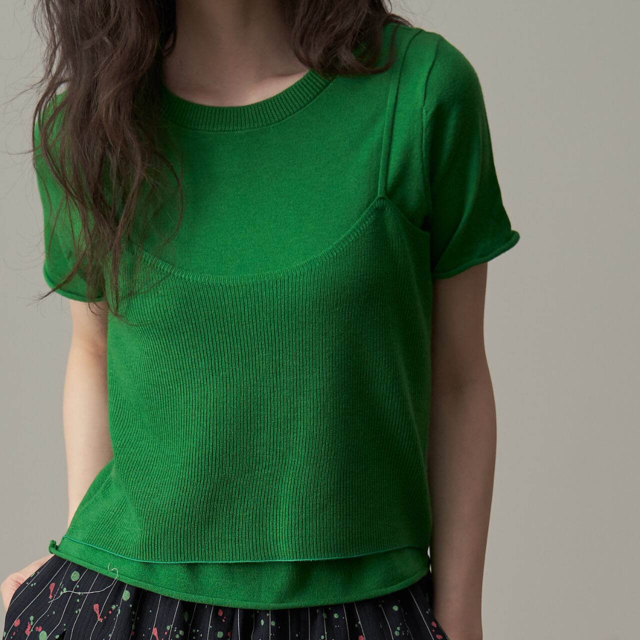 レイヤードスタイルが楽しめるクルーネックニットトップス。
