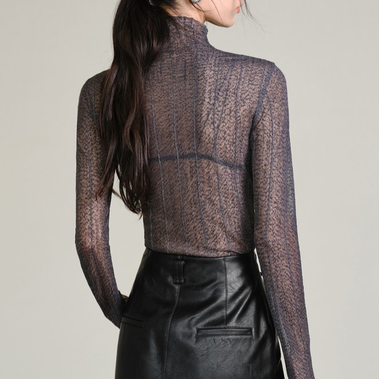 透け感のある素材が魅力的なシースルーハイネックロングスリーブトップス。