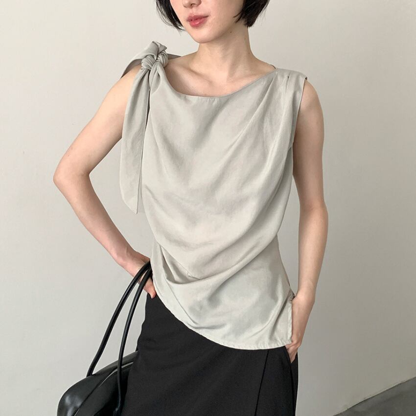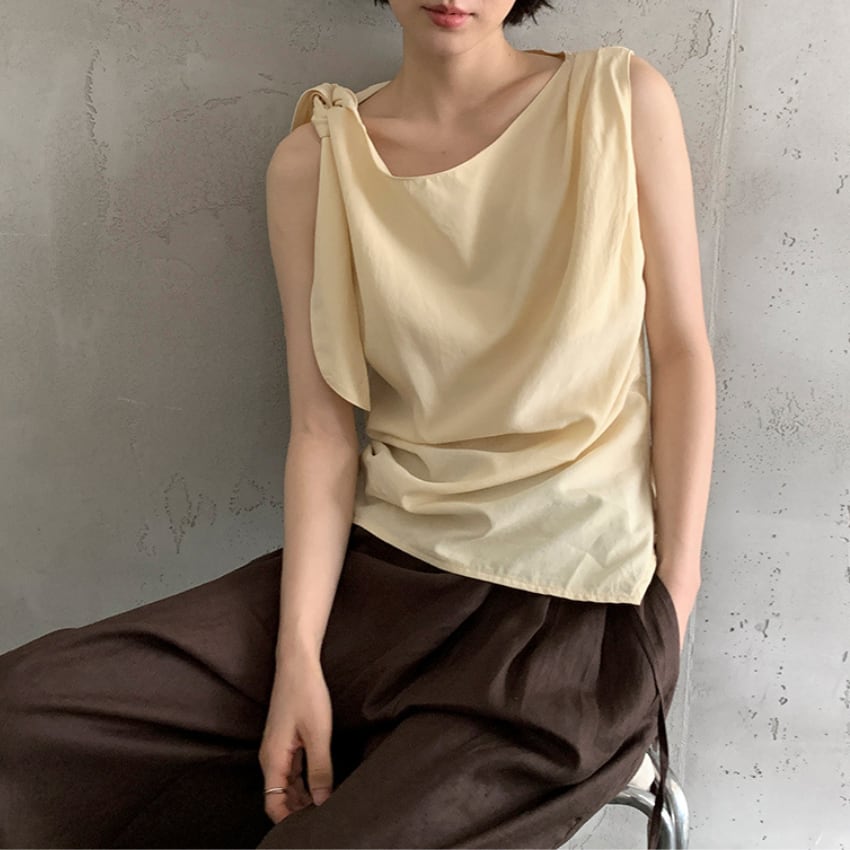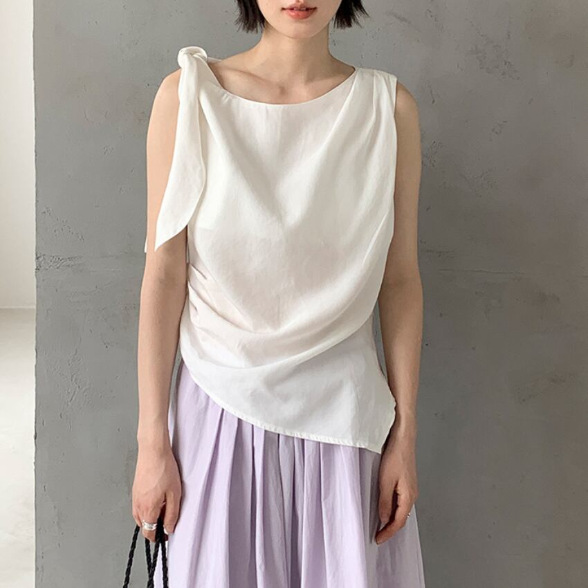 ノットディテールが洗練された雰囲気を演出する、ノースリーブブラウス。