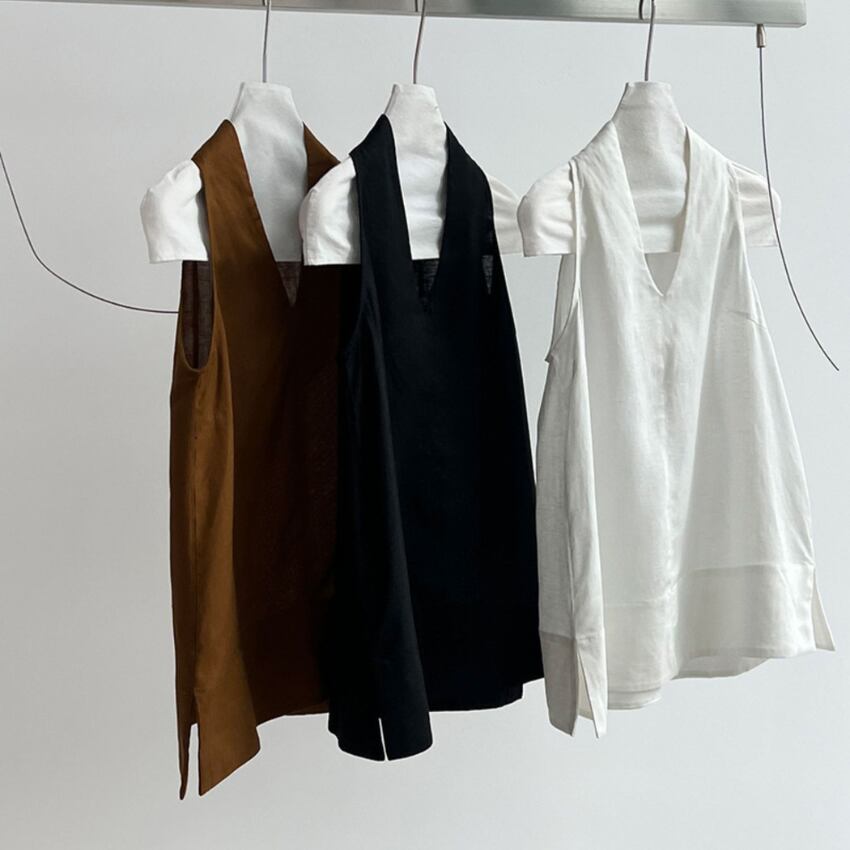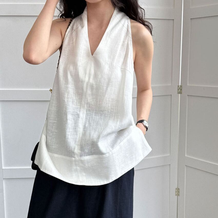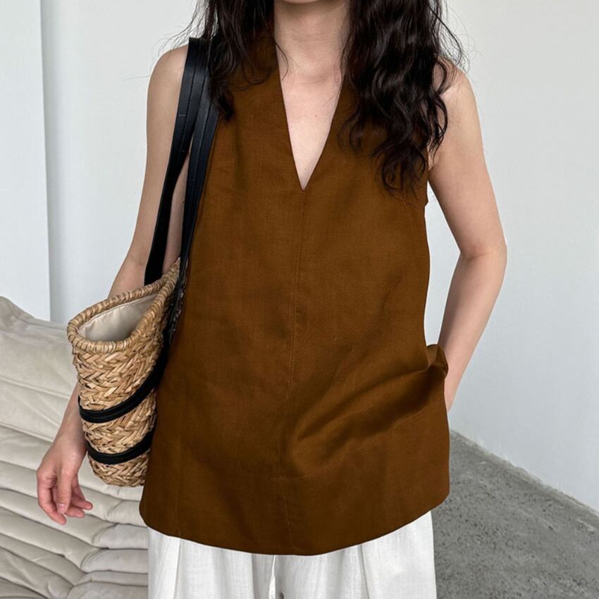 リラックス感のある着心地と、洗練されたVネックデザインが魅力のトップス。