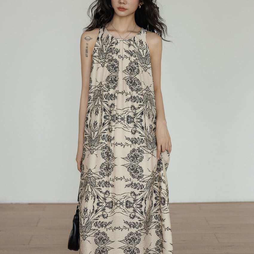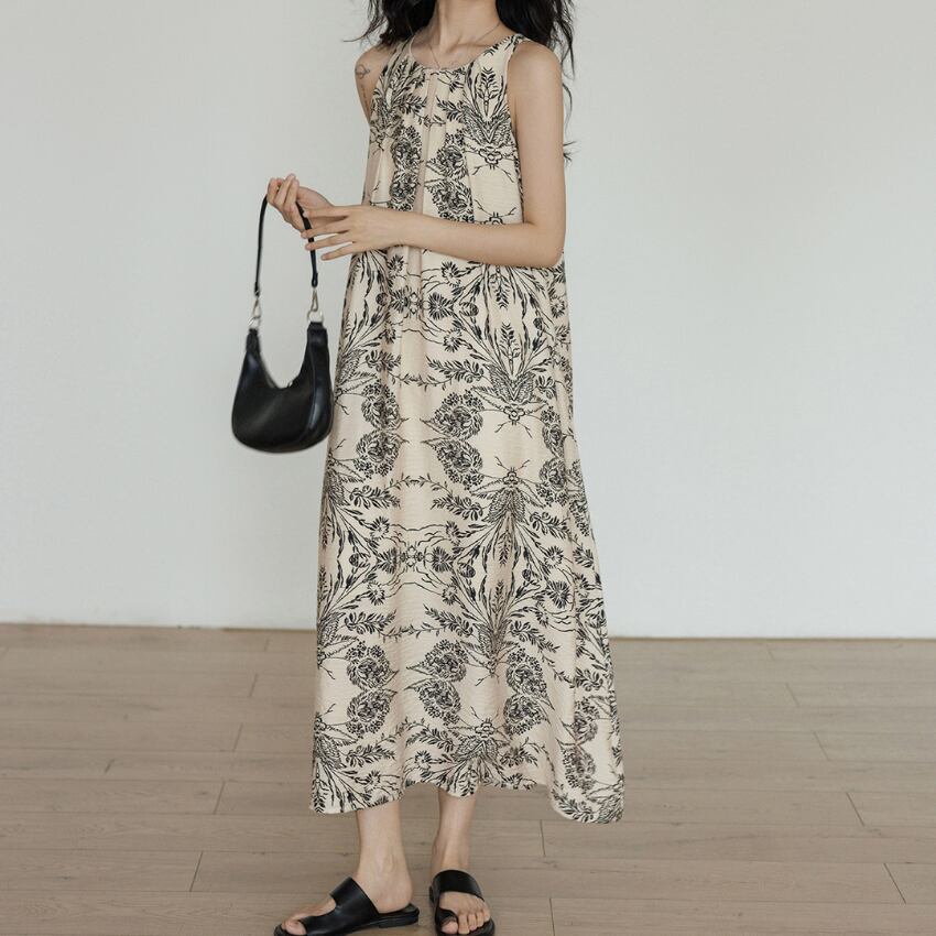 シンプルなデザインながらも、目を惹くプリント柄がアクセントのワンピース。