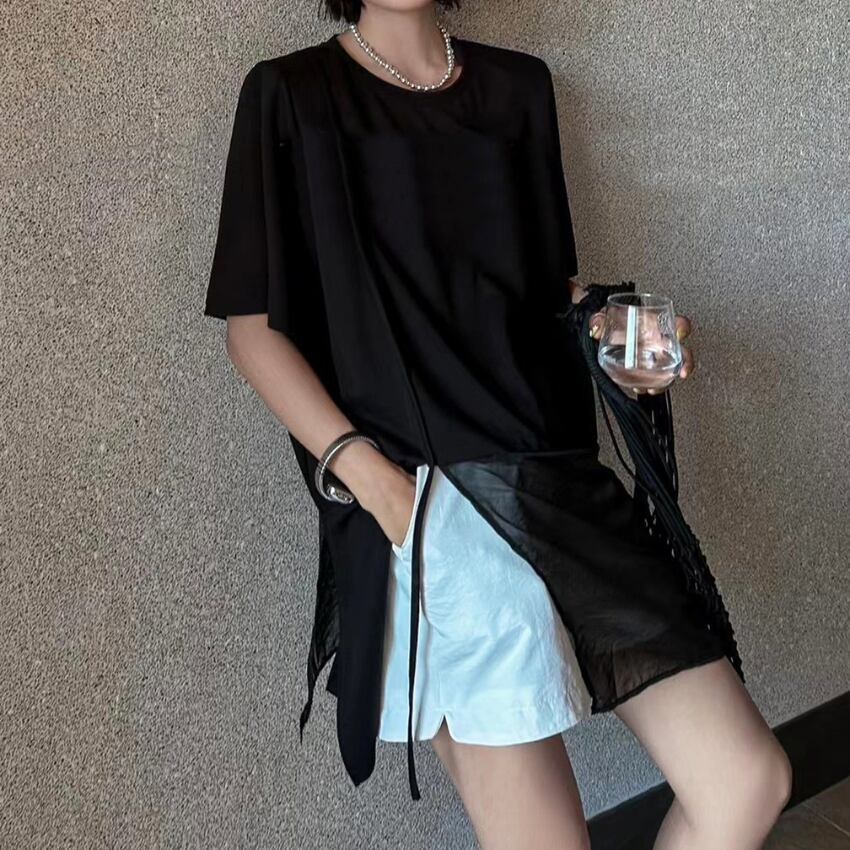 肩パッドとシアー素材の切り替えが特徴的なオーバーサイズのTシャツ。