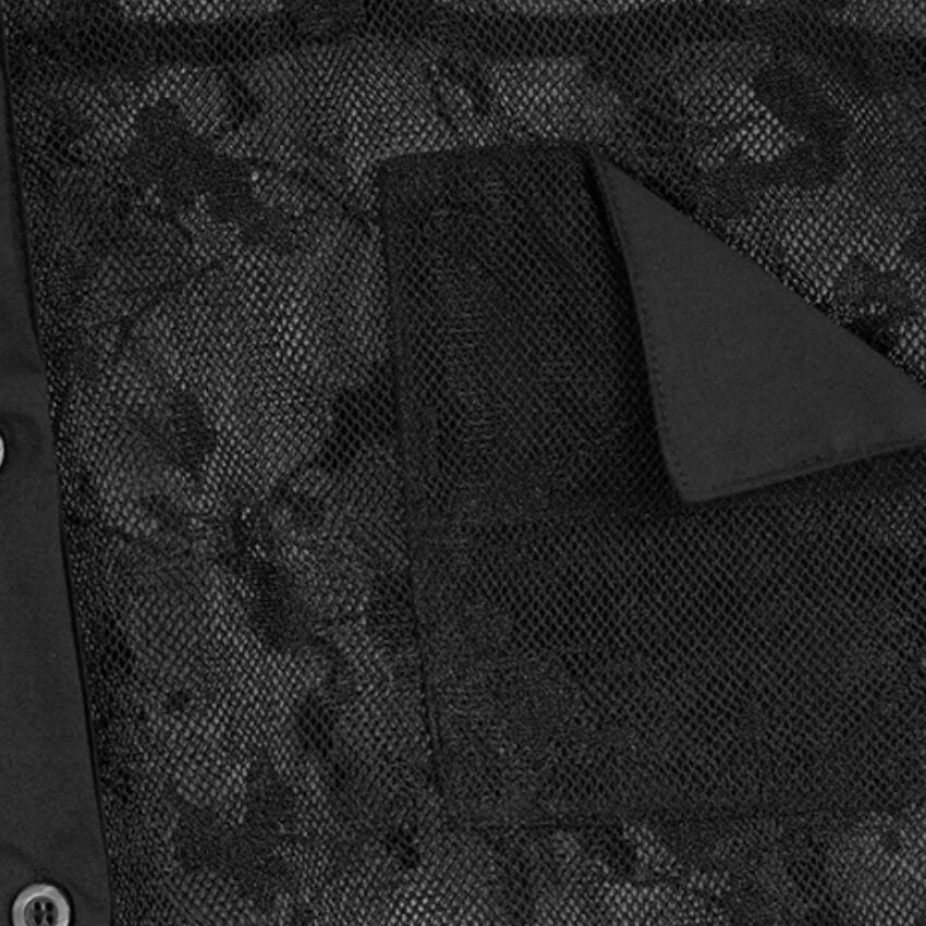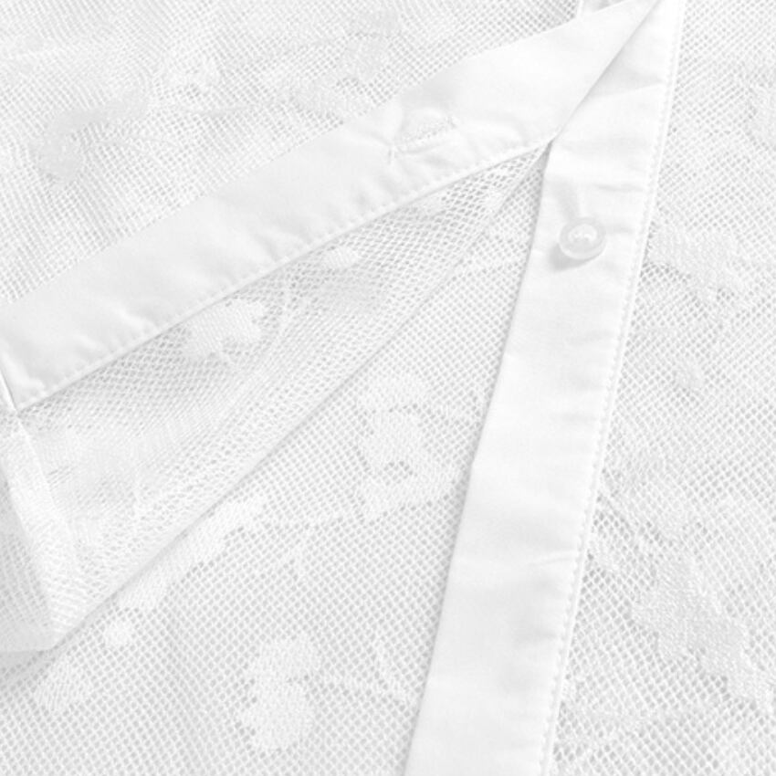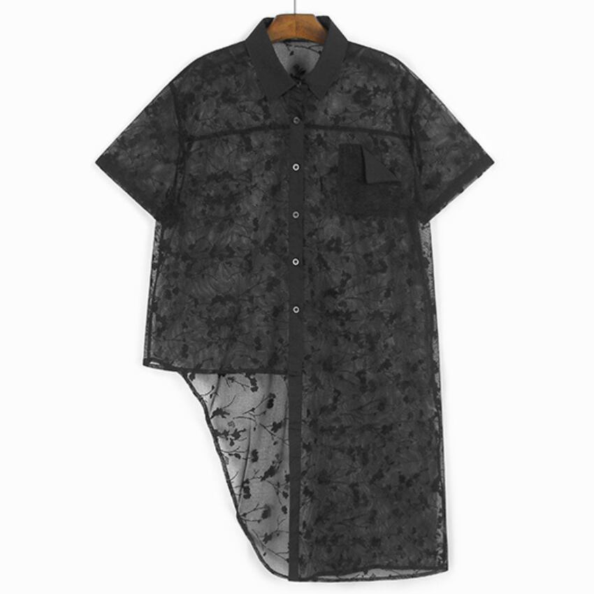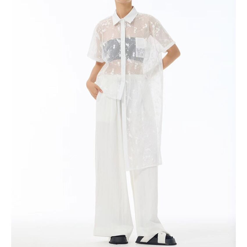 アシンメトリーなシルエットが目を惹く、花柄刺繍シャツ。