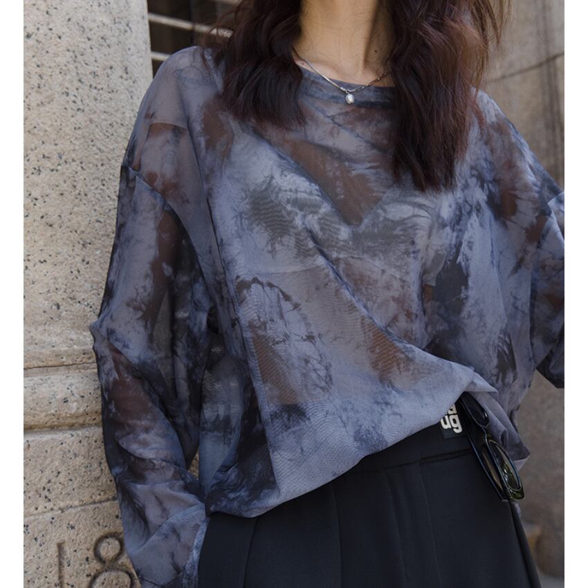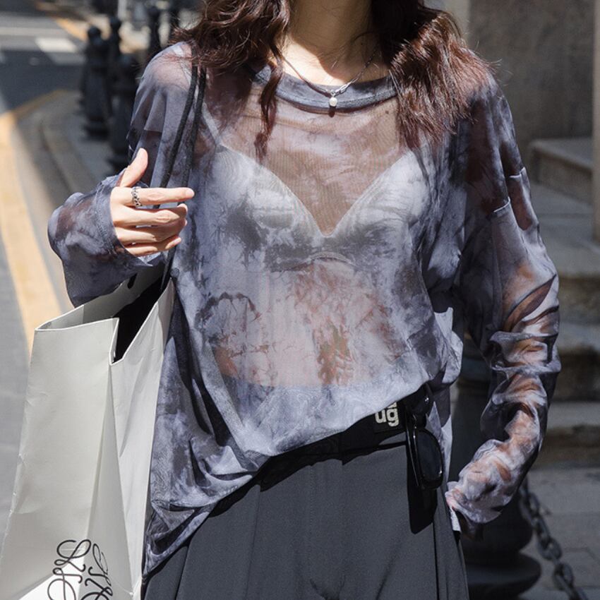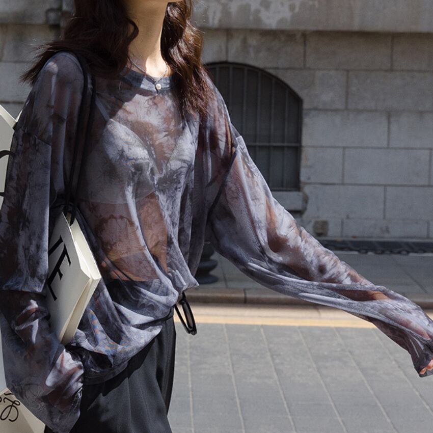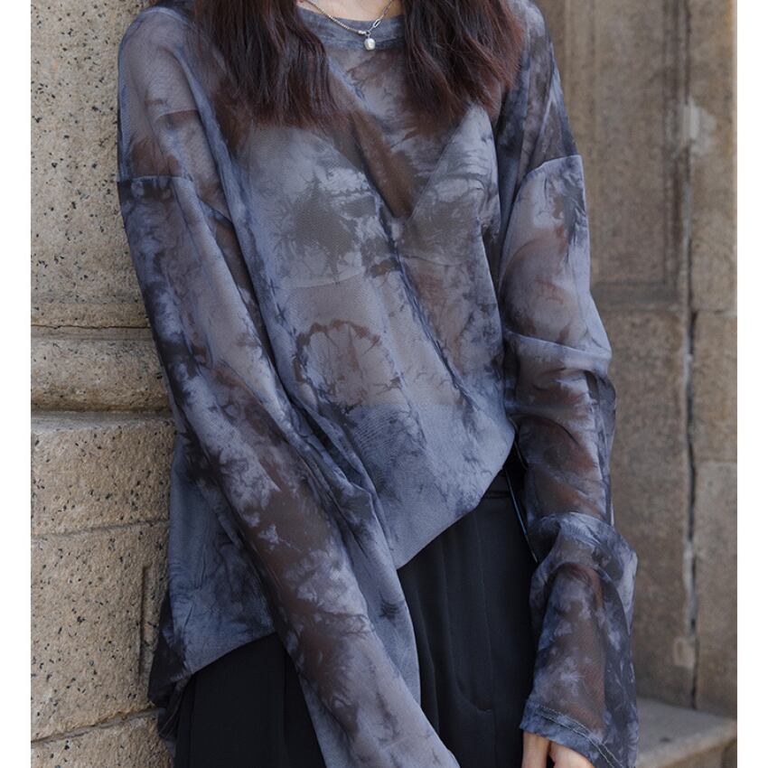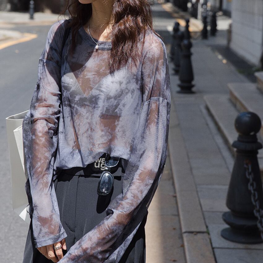 sheer crew neck long sleeve cut and sew top L0612